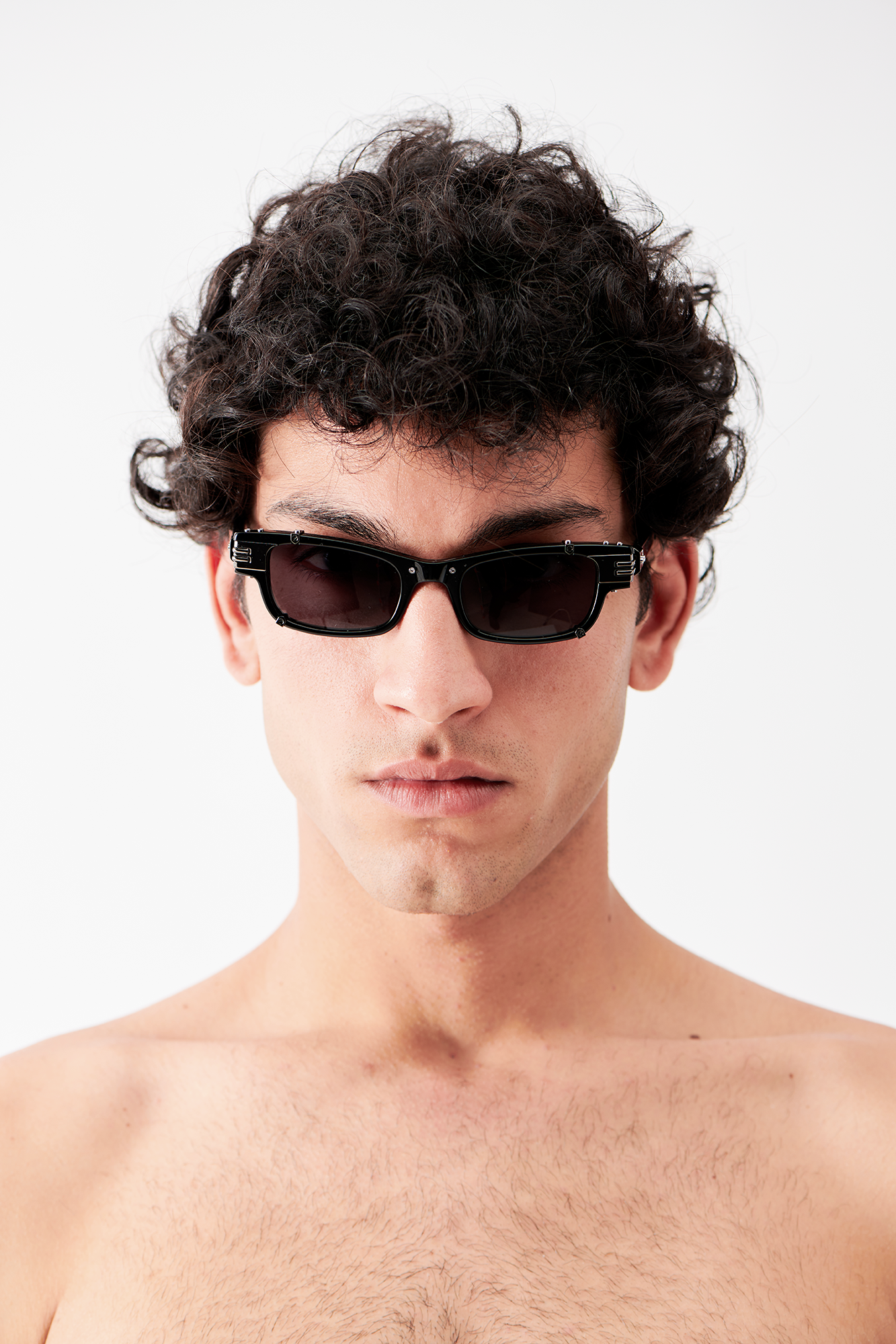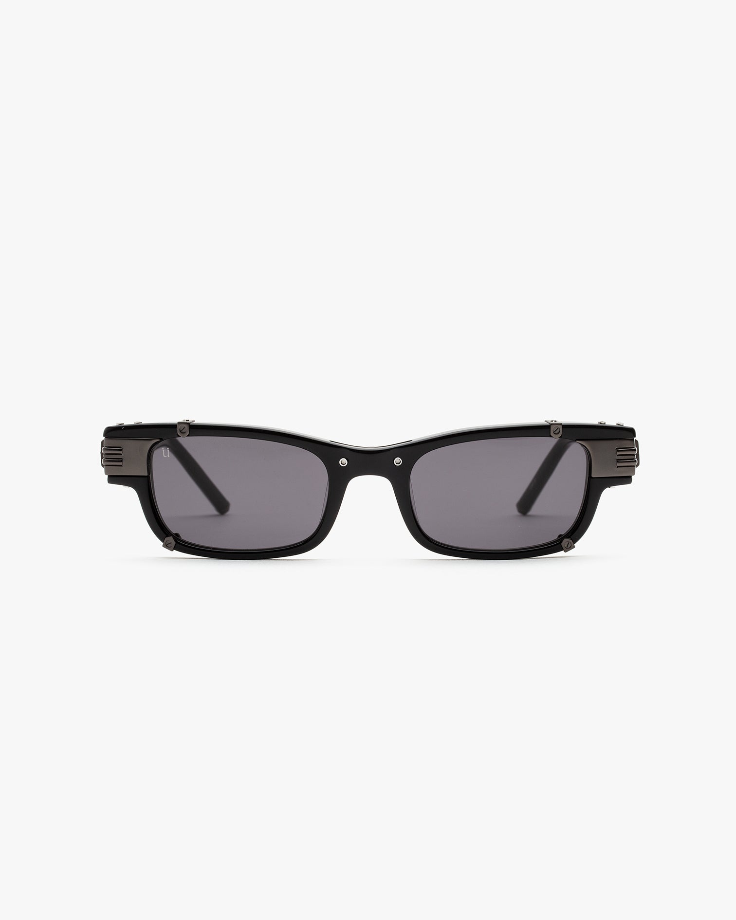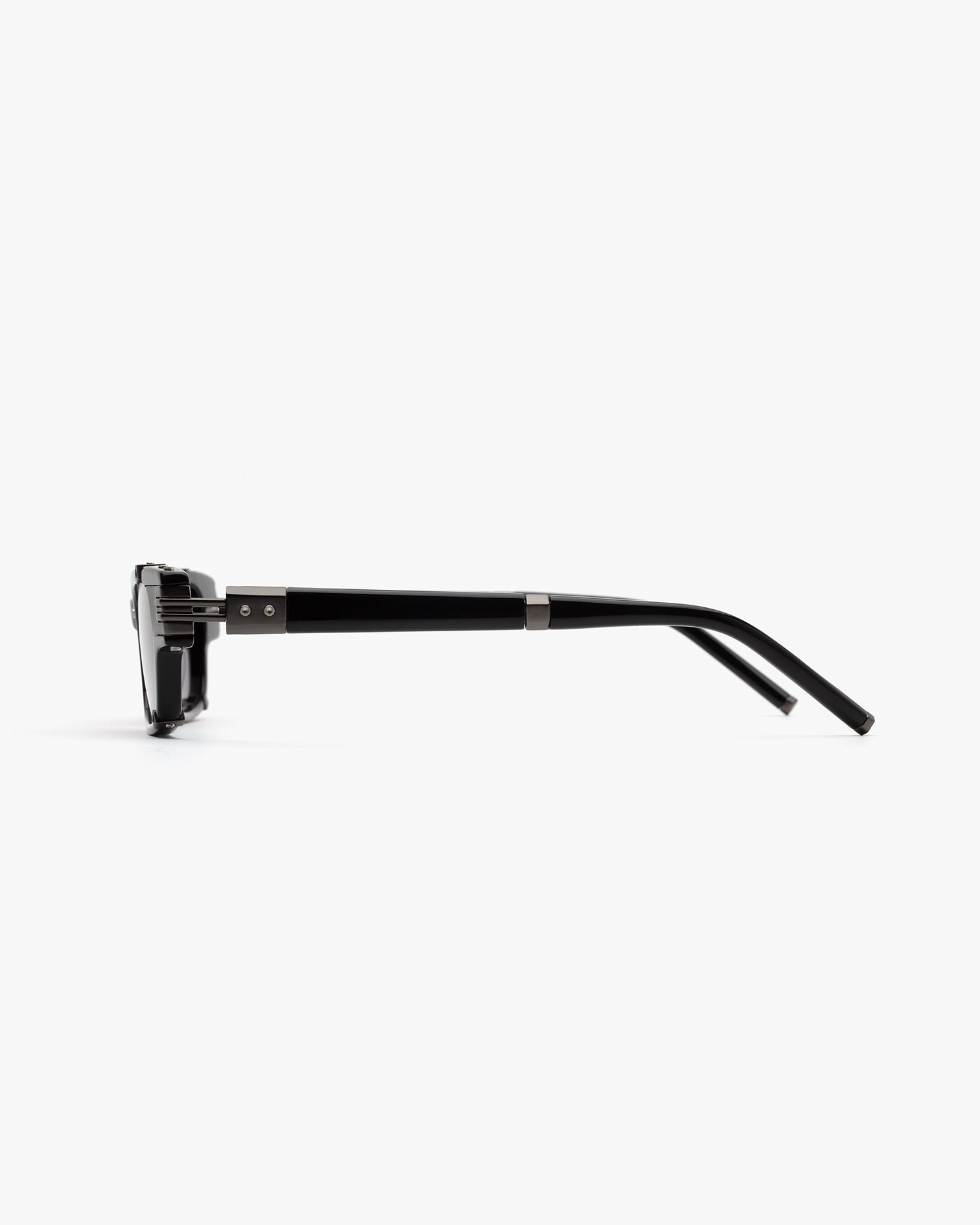 BLACK ACETATE FRAME WITH CUSTOM ACETATE TEMPLES FEATURING METAL HARDWARE AND GRAY LENSES.